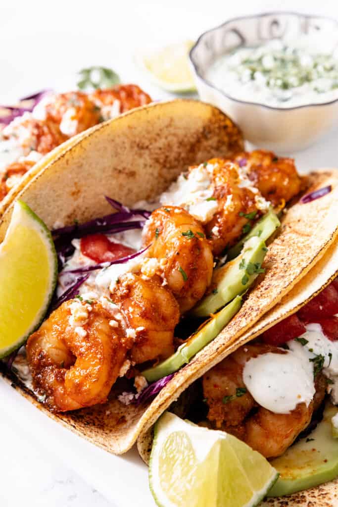 <img loading=“lazy” src=“https://www.errenskitchen.com/wp-content/uploads/2021/06/Easy-Shrimp-Tacos-1-10-683x1024.jpg" onerror=“this.onerror=null;this.src=‘https://blogger.googleusercontent.com/img/a/AVvXsEhe7F7TRXHtjiKvHb5vS7DmnxvpHiDyoYyYvm1nHB3Qp2_w3BnM6A2eq4v7FYxCC9bfZt3a9vIMtAYEKUiaDQbHMg-ViyGmRIj39MLp0bGFfgfYw1Dc9q_H-T0wiTm3l0Uq42dETrN9eC8aGJ9_IORZsxST1AcLR7np1koOfcc7tnHa4S8Mwz_xD9d0=s16000';" alt=“Two shrimp tacos with avocado and red cabbage in corn tortillas, topped with crumbled cheese and creamy sauce, served with lime and extra sauce on the side.