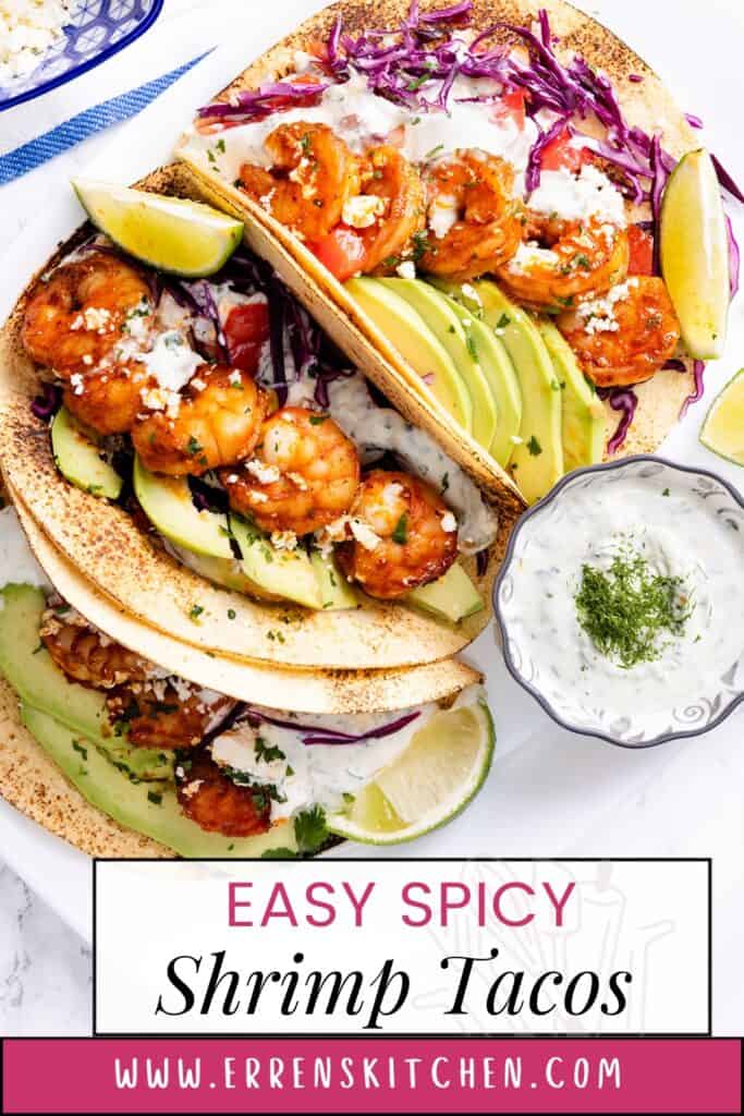 <img loading=“lazy” src=“https://www.errenskitchen.com/wp-content/uploads/2021/06/Shrimp-Tacos-1-683x1024.jpg" onerror=“this.onerror=null;this.src=‘https://blogger.googleusercontent.com/img/a/AVvXsEhe7F7TRXHtjiKvHb5vS7DmnxvpHiDyoYyYvm1nHB3Qp2_w3BnM6A2eq4v7FYxCC9bfZt3a9vIMtAYEKUiaDQbHMg-ViyGmRIj39MLp0bGFfgfYw1Dc9q_H-T0wiTm3l0Uq42dETrN9eC8aGJ9_IORZsxST1AcLR7np1koOfcc7tnHa4S8Mwz_xD9d0=s16000';" alt=“A close-up photo of two shrimp tacos on a white plate. The tacos are filled with seasoned shrimp, sliced avocado, shredded cabbage, and a white crema sauce. Text overlay on the plate reads “Easy Spicy Shrimp Tacos” - 2”>