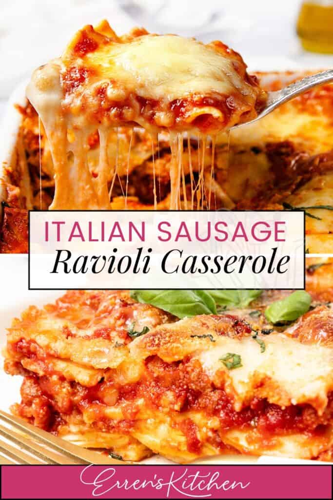 <img loading=“lazy” src=“https://www.errenskitchen.com/wp-content/uploads/2025/01/Italian-Sausage-Ravioli-Casserole-4-683x1024.jpg" onerror=“this.onerror=null;this.src=‘https://blogger.googleusercontent.com/img/a/AVvXsEhe7F7TRXHtjiKvHb5vS7DmnxvpHiDyoYyYvm1nHB3Qp2_w3BnM6A2eq4v7FYxCC9bfZt3a9vIMtAYEKUiaDQbHMg-ViyGmRIj39MLp0bGFfgfYw1Dc9q_H-T0wiTm3l0Uq42dETrN9eC8aGJ9_IORZsxST1AcLR7np1koOfcc7tnHa4S8Mwz_xD9d0=s16000';" alt=“Close-up of a cheesy Italian sausage ravioli casserole. The top image shows melted cheese being lifted, revealing ravioli layers beneath. The bottom image displays a slice with rich tomato sauce and a sprig of basil. Text overlay: “Italian Sausage Ravioli Casserole. - 3”>