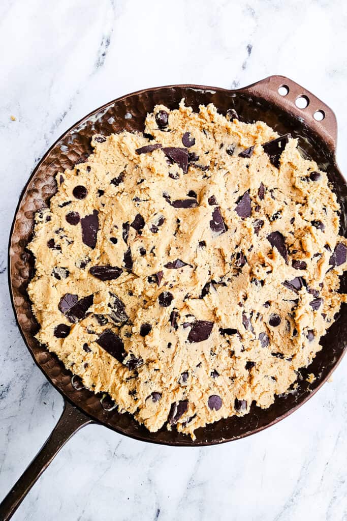 <img loading=“lazy” src=“https://www.errenskitchen.com/wp-content/uploads/2024/04/Skillet-Cookie-1-8-683x1024.jpg" onerror=“this.onerror=null;this.src=‘https://blogger.googleusercontent.com/img/a/AVvXsEhe7F7TRXHtjiKvHb5vS7DmnxvpHiDyoYyYvm1nHB3Qp2_w3BnM6A2eq4v7FYxCC9bfZt3a9vIMtAYEKUiaDQbHMg-ViyGmRIj39MLp0bGFfgfYw1Dc9q_H-T0wiTm3l0Uq42dETrN9eC8aGJ9_IORZsxST1AcLR7np1koOfcc7tnHa4S8Mwz_xD9d0=s16000';" alt=“Overhead image of chocolate chip cookie dough spread evenly in a round cast-iron skillet, placed on a white marble surface.